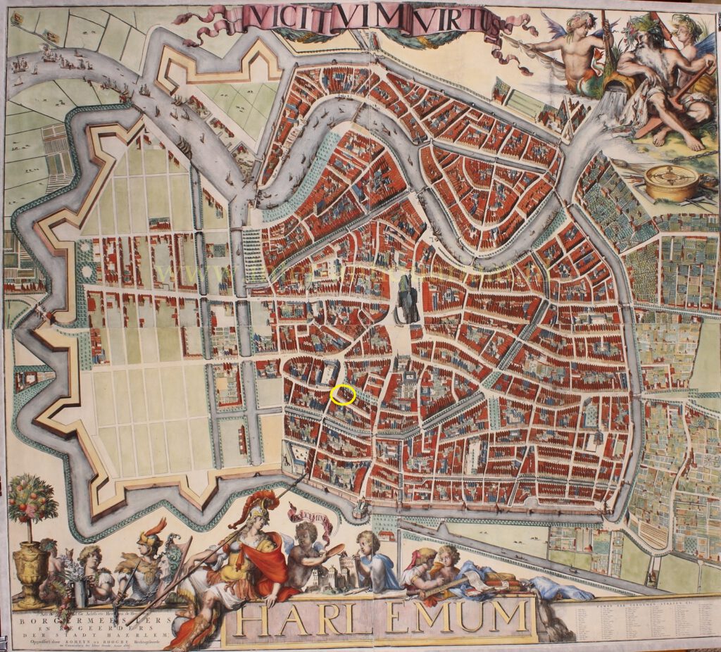 Plattegrond van Haarlem door Romeijn de Hooghe, 1688, het pakhuis is al zichtbaar.